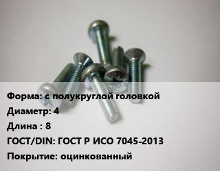Винт с полукруглой головкой 4х8 ГОСТ Р ИСО 7045-2013 оцинкованный