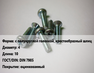 Винт с полукруглой головкой, крестообразный шлиц 4х10 DIN 7985 оцинкованный, кг цена от 216 ₽ / кг, где купить, условия доставки в Санкт-Петербурге и Ленинградской области